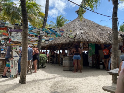 We started out to taxi over to Mambo Beach. The taxi drivers quote you a price for a shared ride, but you need to wait for others. I was willing to pay extra for a private taxi, which they were reluctant to give – just then some people from our group showed up and we filled up a mini van and headed out from the port. The beach at Mambo was crowded as usual, and we found our group way down at the end. I was disappointed in the “nachos” which seemed to be chips with a can of chili dumped on them. The food on the ship had been tasteless and I was hoping for a fish taco but alas…. no.