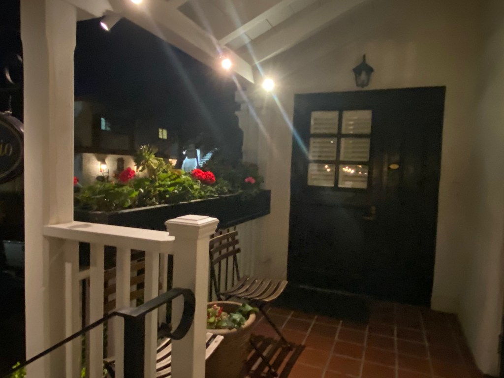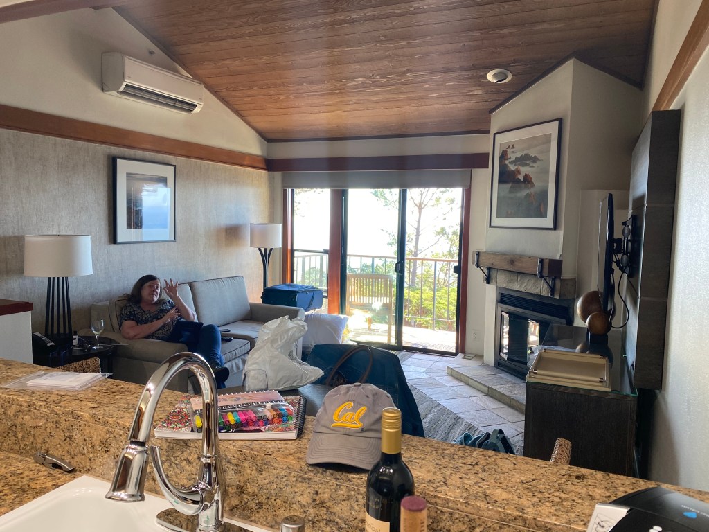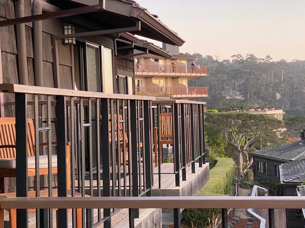 The Hyatt Regency – Carmel Highlands is about 4 miles south of Carmel-By-The-Sea village. The Townhouse style one bedroom spa suite had beautiful views overlooking the swimming pool, but straight out to see the waves crashing. We had a small balcony with two chairs and a little table. There was a row of townhouses, so you are pretty close to others during sunset if you are out there. The king bedroom with huge spa tub is downstairs with a cove view from the bed. It’s equipped with a kitchen, a very comfortable pull out couch, a counter height bistro table and a condo sized kitchen with full sized refrigerator and dishwasher. The upstairs bathroom also had a shower, making this an ideal place to share with even a non romantic room mate and have separation.https://www.hyatt.com/en-US/hotel/california/hyatt-carmel-highlands-overlooking-big-sur-coast-and-highlands-inn-a-hyatt-residence-club/higph