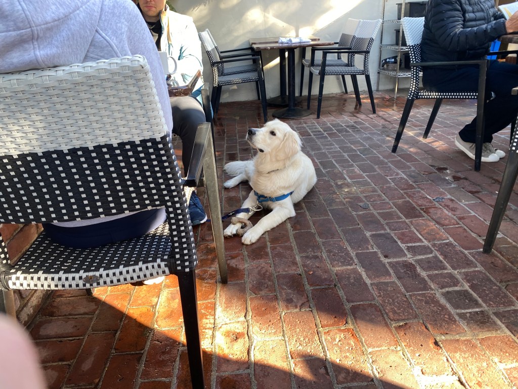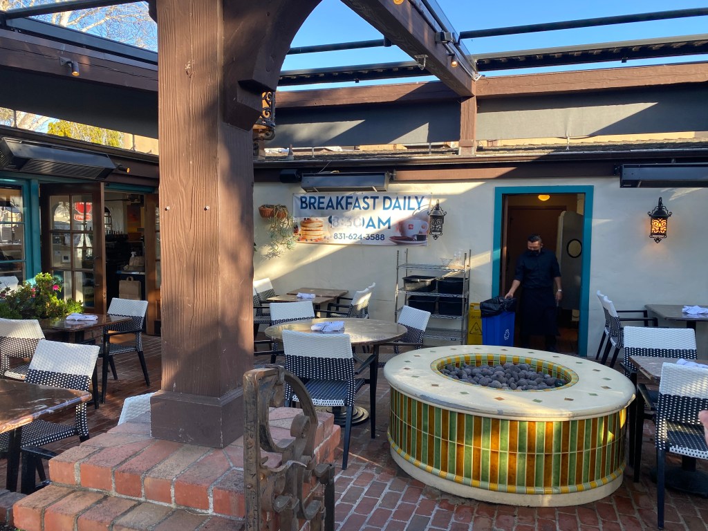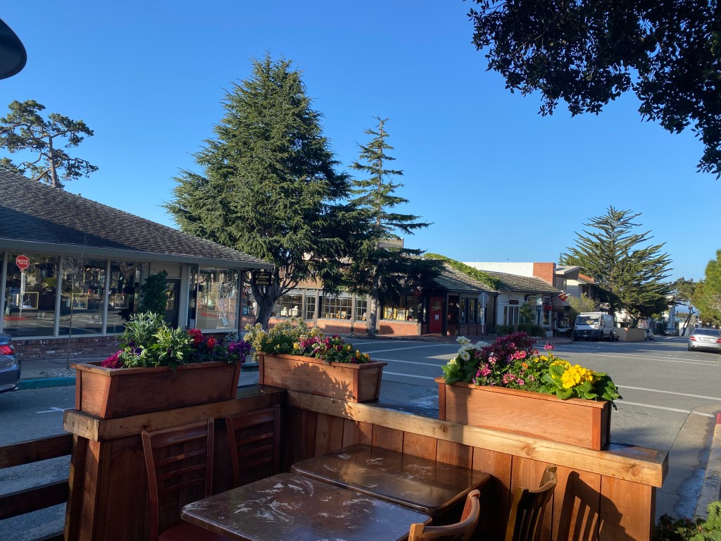 We had breakfast at the Village Corner – it deserved the hype from Trip Advisor and Yelp. They open at 8:30 – people start arriving around 8:15 to snag a table. They had plenty of space, the food was delicious and the service prompt and friendly. They say they serve brunch all day. They have a great courtyard with a fire pit and all the designer doggies were there. https://villagecornercarmel.com/